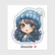 Un delicioso pegatina de vacaciones exhibe un personaje encantador, adornado con un gorra y suéter azul acogedor, listo para celebrar a los Navidades. Le rodean espumosos copos de nieve, que evocan la magia de las festividades de invierno y el alegre espíritu vacacional.