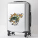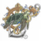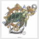 Una tortuga marina verde nadando junto a una rueda de barco, una cuerda y un ancla. Arte estilo tatuaje.