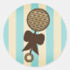 Pegatinas con ducha para bebés iluminados con una sonda marrón y beige de inspiración vintage, con un arco sobre un fondo de rayas azules. Busque invitaciones coincidentes, franqueo y más en Jill's Paperie.