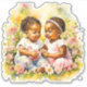 Bebés chicas gemelos de pegatinas de ducha de flores de color rosa. Niñas acuarelas sentadas en flores rosadas.
