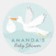 Un bonito pegatina de ducha con temática neutra de género con cigüeñas y adornos de colores verde azulados azul, naranja y blanco. Una cigüeña feliz se desliza llevando un nuevo bulto de alegría mientras vuela contra un suave cielo azul acuático salpicado de nubes esponjosas. En este diseño de diseño completamente moderno, con ilustraciones originales y una tipografía de moda y caprichosa, se revisita una temática tradicional. La invitación a la ducha de bebé coincidente está disponible en mi tienda kat_parrella.