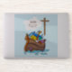 El Arca de Noé sobre un regalo de bautismo de un niño azul es tan precioso. Los animales miran desde el Arca de Noé, viendo la cruz a través de las nubes. Dulce por regalar a un niño mientras está bautizado.