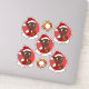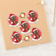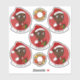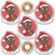Conjunto de siete pegatinas cortados de vinilo con el ilustracion de un lindo niñito afroamericano sonriente y feliz o un chica, que está vestido con ropa de Navidad y está usando un gorra rojo de Santa Claus y sosteniendo un regalo, en un fondo rojo; cinco pegatinas del bebé y dos pegatinas con una corona de Navidad; con una plantilla de texto de personalizable para su nombre o mensaje