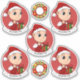 Conjunto de siete pegatinas cortados de vinilo con el ilustracion de un lindo y feliz bebé sonriente o un chica, que está vestido con ropa de Navidad y lleva un gorra rojo de Santa Claus y sostiene un regalo, sobre un fondo rojo; cinco pegatinas del bebé y dos pegatinas con una corona de Navidad; con una plantilla de texto de personalizable para tu nombre o mensaje