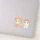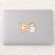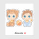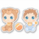 Bebés personalizados en enterizos. La de la izquierda está vestida con un traje de salto de oso marrón con una buna amarilla y una abeja minúscula. El de la derecha está vestido con un enterizo azul con una bata amarilla y sosteniendo a un bebé sonriendo. La bola brillante descansa entre ellos.