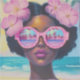 un retrato impresionante y vibrante de una mujer de diseño con gafas de sol rosas gigantes que reflejan una playa tropical de ensueño. Rodeada de suaves flores de hibisco y con un fondo oceánico turquesa, esta obra de arte captura la esencia del verano, la belleza y el empoderamiento. Ideal para los amantes de la playa, los coleccionistas de arte vanguardista y la decoración tropical.