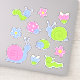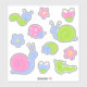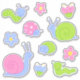 Un conjunto de bichos lindos verdes, azules, rosados y púrpura. 2 caracoles, 4 bichos y 5 flores. Arte de Laura Nikiel