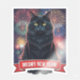 Fluffy black cat with bright yellow eyes in front of a New Year fireworks display. Vivid, photorealistic, and festive Meowy New Year sticker