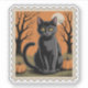 This captivating postage stamp features a sleek black cat with luminous yellow eyes, sitting attentively amidst two small pumpkins. The background depicts a classic Halloween scene with bare trees silhouetted against a full moon and an eerie orange sky. Perfect for sending spooky season greetings, party invitations, or for collectors who love feline and Halloween-themed designs, this stamp combines charm with a touch of mystery.