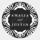 Selle sus sobres de invitación a la boda, favores y más con nuestros elegantes pegatinas de inspiración marroquí en blanco y negro clásico. El diseño de redondeo incluye los nombres conectados por escritura decorativa y rodeados por un borde geométrico en blanco sobre un fondo negro rico. Coordina con nuestra colección de invitaciones a bodas de Marrakech en negro.
