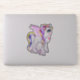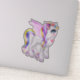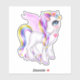 Decal de vinilo / pegatina de contorno con una imagen de unicornio con grandes ojos azules, alas rosadas y una forma y cola arcoiris. Kawaii lindo.