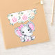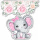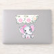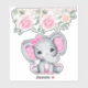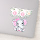 Pegatina de caries/ contorno de vinilo con un ilustracion de acuarela de elefante rosa lindo. Ella tiene unas orejas puntiagudas rosadas y blancas de polka y un arco de cinta rosada en la parte superior de su cabeza. La parte superior está decorada con un bonito ramo de rosas.