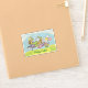 Este pegatina de vinilo tiene un grupo de conejitos de Pascua que llevan canastas con huevos de colores vestidos con ropa de colores pastel que corren por la hierba bajo un cielo azul con nubes. Personalizar el texto Feliz Pascua con la plantilla.