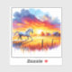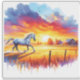 Un impresionante caballo se pasea con gracia a través de un campo acuático vívido al atardecer. Los cálidos tonos naranja y rosa contrastan con el entorno rural de una casa de campo y una valla rústica, creando un ambiente pintoresco y sereno.