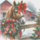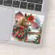 sticker de Navidad. Caballo marrón bonito con arco rojo bonito detrás de una valla rústica de madera con una guerra festiva. Al fondo hay un antiguo granero rojo rústico.