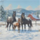 Una hermosa familia de caballos negros de appaloosa en la nieve en un pasto en una granja. Detrás de ellos hay un pintoresco paisaje invernal que incluye un granero rojo, árboles y colinas.