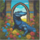 Una hermosa escena de fantasía con un atractivo caimán azul, rodeado de flores coloridas y frente a un arco. Asistido por IA, con ediciones, etc