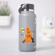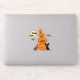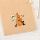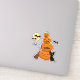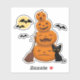 Un gato negro y una escoba de brujas cerca de una pila de calabazas que se están cayendo.