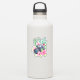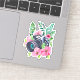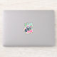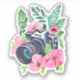 Flores rosadas, follaje verde y pegatinas de cámara antigua.