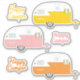 Este conjunto retro de pegatina de camper te hará feliz. Camperas ilustradas naranjas, amarillas y rosas junto con elegantes letras de guiones vestirán tus cosas.