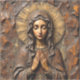 "This striking design presents a portrait of the Virgin Mary as a detailed wood carving or relief sculpture, rendered in rich, warm brown and reddish-brown tones. She is depicted with a tranquil, contemplative expression, hands clasped in prayer, and is framed by a rustic, textured halo. The rough, earthy texture of the wood grain provides a powerful sense of ancient, grounded spirituality. This design is highly suitable for products with a rustic, spiritual, or devotional theme. Imagine it on wooden plaques, religious art prints, handcrafted items, or home decor that evokes a traditional, artisan aesthetic."