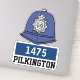 Casco de establo de policía masculino del Reino Unido con nombre y número con antecedentes blancos. Pegatina de policía de sexo masculino.