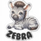 Este gran pegatina infantil presenta una cebra bebé adorablemente linda al estilo personalizado con una expresión dulce y entrañable. La cebra se ve tumbada con sus pequeñas piernas escondidas bajo su cuerpo. Tiene un estilo clásico a rayas negras y blancas, grandes ojos azules expresivos y un pequeño tufo de la cabeza que le confiere un aspecto encantador. Debajo de la cebra, la palabra "ZEBRA" está escrita en negritas y alegres letras, a la perfección a la altura del diseño lindo y amigable con los niños.