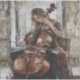 A young blonde woman in a flowing red dress plays a cello gracefully by a sunlit window, captured in soft, impressionistic brushstrokes evoking timeless elegance and musical passion.
