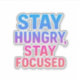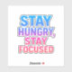Límites de presión con este audaz pegatina "Permanecer hambriento, concentrado". Perfecto para portátiles, coches, botellas de gimnasio y ordenadores portátiles. Una cita motivacional de moda para los estafadores, soñadores y triunfadores que nunca renuncian.