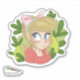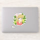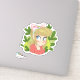 Pegatina linda de una ilustración de una niña de dibujos animados con un lazo rosa y rodeada de hojas verdes. Ideal para scrapbooking, planificación y para aquellos que aman las pegatinas lindas.