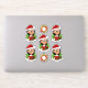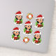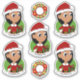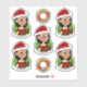 Conjunto de siete pegatinas cortados de vinilo con un ilustracion de una linda y pequeña latina sonriente feliz o un chica asiático de pelo largo y marrón, que está vestido con ropa de Navidad y lleva un gorra rojo de Santa Claus, con un fondo verde; cinco pegatinas del chica y dos pegatinas con una corona de juramento; con una plantilla de texto de Navidad para tu nombre o mensaje