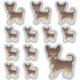 El original ilustracion personalizado de Destei de un perro de raza Chihuahua de chocolate y abrigo suave. El diseño se coloca 12 veces sobre la hoja en tres tamaños diferentes. Hay un perro más grande, tres perros medianos y ocho perros pequeños.