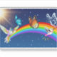 Cielo nocturno, dos pájaros, mariposas y un arcoíris vívido.