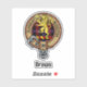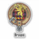 Insignia escudo de Clan Brown rodeada por una correa y hebilla sobre fondo tartán. Texto personalizado.