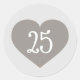 Esta pegatina redonda presenta un corazón de plata maciza con forma atractiva con el texto de plantilla, "25". La pegatina de corazón de plata maciza redonda funciona bien como una adición de celebración para botellas de vino, caramelos, sobres o bolsas de regalo para fiestas de compromiso, despedidas de soltera, cenas de ensayo, bodas o celebraciones de aniversario. Las pegatinas de corazón de plata son perfectas para anuncios de bodas de aniversario de 25 años, notas de agradecimiento y favores de fiesta. Personalice con los nombres de la novia y el novio, y la fecha de la boda o aniversario.
