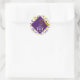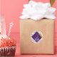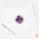 Favor de fiesta de graduación creativa y pegatinas de regalo, con gorra morada y borla dorada sobre fondo de confeti. Edite el texto para agregar el nombre del graduado y el año de la clase.