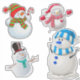 Cuatro ilustraciones de muñecos de nieve juguetones en colores festivos y atrevidos, cada uno con sombreros, bufandas, mitones y una escoba o sombrero de copa. Genial para campañas navideñas, escenas invernales, tarjetas de felicitación y diseños temáticos familiares.