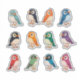 A lively collection of twelve cartoon-style bird stickers in bright colors. Ideal for kids crafts, scrapbooks, or classroom décor, conveying friendship, playfulness, and nature-inspired charm.