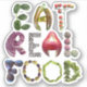 Muestra frutas y verduras reales que explican Comer comida real en claras y hermosas fotografías usando mi fuente fonética. ¡Incluye tomates, pimientos, peras, col, higos, aceitunas, ocra y hojas de león!