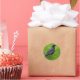 Pegatina redonda con un pequeño pájaro negro en la hierba.