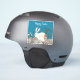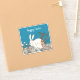 Este pegatina de vinilo es un conejo blanco esponjoso y bonito sentado en un suelo gris entre flores blancas y naranjas sobre un fondo azul. Personalizar el texto Feliz Pascua con la plantilla.