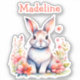 Un pequeño conejo dulce rodeado de flores rosadas y coralinas, ilustracion acuarela pegatina personalizado.