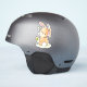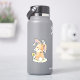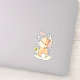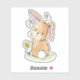 Lindo conejo marrón pintado con acuarela asomándose por encima del hombro para que puedas ver su cola blanca y esponjosa. Zumbando alrededor de su cabeza hay dos abejorros amarillos y negros. A su lado hay una simple flor de dibujos animados amarilla con hojas y tallo verdes. Cute pegatina caprichosa inspirada en la naturaleza.