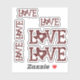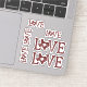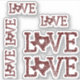 Las letras occidentales angustiadas de la palabra "AMOR" con la palabra "O" reemplazadas por el estado de Texas con un corte de corazón. Disponible en U T Longhorns naranja quemado, Texas A & M Aggies maroon, Tech Raiders rojo, negro, azul bandera del estado, cactus verde y morado periwinkle. En la hoja extra pequeña, el gran pegatina tiene unos 2" de ancho, los pequeños pegatinas de 1" de ancho.