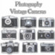 Nueve imágenes de cámara antiguas en blanco y negro, junto con dos pegatinas de texto en personalizable. Se puede usar para publicitar tu negocio fotográfico o simplemente para amar las cámaras vintage.