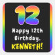 Este animado y alegre diseño de pegatina cuadrado con temática de cumpleaños presenta el número "12" con un patrón de gradiente inspirado en el espectro de arcoiris multicolor, junto con el mensaje "Feliz 12 cumpleaños", y un nombre de destinatario personalizado. Pegatinas como estos pueden ser usados o entregados en un fiesta realizado en celebración del 12 cumpleaños de alguien, o tal vez usados al preparar invitaciones o empaquetar regalos para un evento de este tipo. [~Z0000630]