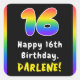 Este divertido y audaz diseño de pegatina cuadrado con temática de cumpleaños presenta un gran número de "16" con un vibrante patrón de gradiente inspirado en el espectro del arcoiris multicolor, junto con el mensaje "Feliz cumpleaños número 16", y un nombre de destinatario del personalizable. Pegatinas con temas de cumpleaños como estos pueden ser usados o distribuidos en una fiesta de cumpleaños que celebra el 16º cumpleaños de alguien, o tal vez usados al preparar invitaciones o regalos para un evento de este tipo. [~Z0000630]