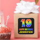 Este divertido, colorido y alegre diseño de pegatina temático de cumpleaños incluye un gran número "19" y el mensaje "FELIZ CUMPLEAÑOS", ambos con un colorante inspirado en el gradiente del espectro del arcoiris, junto con un nombre personalizado amarillo en negrita. El fondo es negro de color. Pegatinas divertidos como este pueden ser usados cuando se envuelve un regalo de cumpleaños o se le da a alguien que está celebrando su cumpleaños número 19, o tal vez se les pueda entregar a los invitados en una celebración de cumpleaños. [~Z0000480]