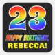 Este colorido, alegre y divertido diseño de pegatina con temática de cumpleaños presenta un gran número "23" y el mensaje "FELIZ CUMPLEAÑOS", ambos coloreados con un patrón inspirado en el gradiente del espectro del arcoiris, junto con un nombre personalizado amarillo en negrita. El fondo es negro de color. Este tipo de pegatinas con temas de cumpleaños divertidos podrían ser usados cuando se envuelve un regalo o un regalo para alguien que está celebrando su cumpleaños 23, o tal vez se los entregue a los invitados en una fiesta de cumpleaños. [~Z0000480]