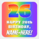Este alegre y emocionante diseño de pegatina cuadrado de cumpleaños presenta un gran número de "26" con un colorido patrón de gradiente inspirado en el espectro de arcoiris, junto con el mensaje "FELIZ 26º CUMPLEAÑOS", y un nombre de receptor de personalizable. El fondo también presenta un divertido patrón de gradiente inspirado en el espectro del arcoiris multicolor. Pegatinas alegres, divertidos y personalizados como este pueden ser dados como regalo de cumpleaños, o usados al envolver regalos, o quizás usados como decoración de fiestas de cumpleaños cuando se celebra el 26 cumpleaños de alguien. [~Z0000571]